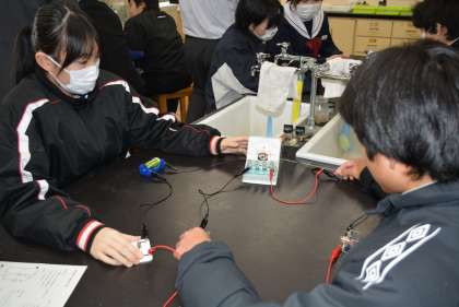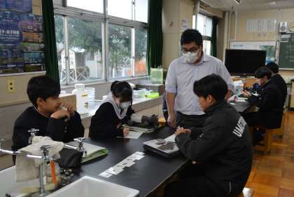 2年1組で理科の研究授業を行いました。並列回路を流れる電流の大きさについて、前時に行った直列回路の結果をもとに予想を立て、実験を行いました。回路を組み立てるのに苦労しているグループもありましたが、協力して実験を行い、結論を導いていました。