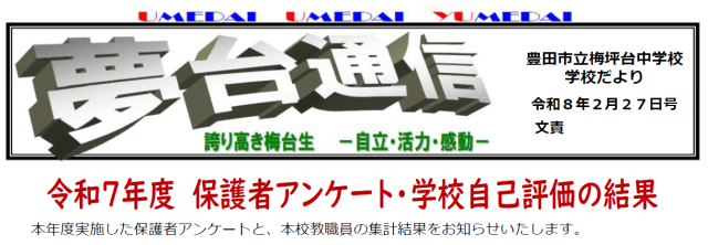 保護者の皆様、地域の皆様、今年一年、本校の教育活動への多大なるご理解、ご支援、誠にありがとうございました。3月に「梅坪台中学校でよかった」と思えるように、一生懸命取り組んでいきたいと思います。来年も、よろしくお願いいたします。