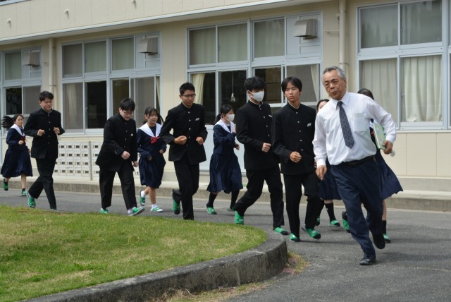 その後、南海トラフ巨大地震を想定した地区ごとの集団下校への隊形移動の確認を行いました。