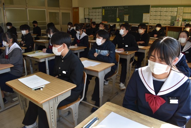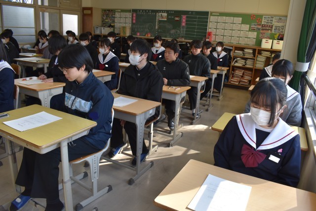 問題用紙(解答用紙)が配付され、テスト開始を待つ22学級の様子です。