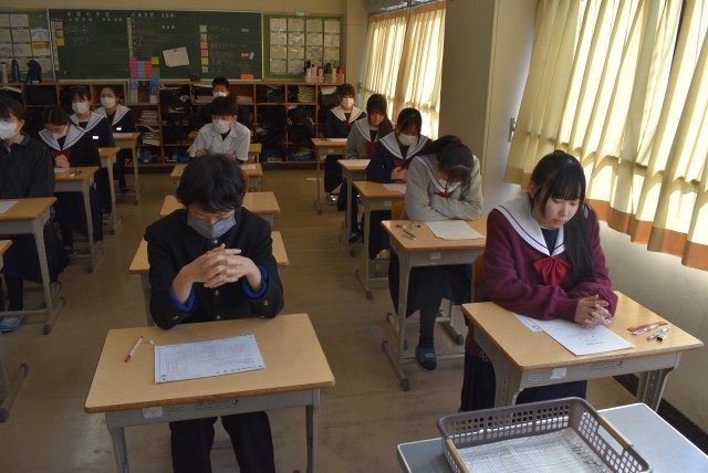 問題用紙(解答用紙)が配付され、テスト開始を待つ21学級の様子です。