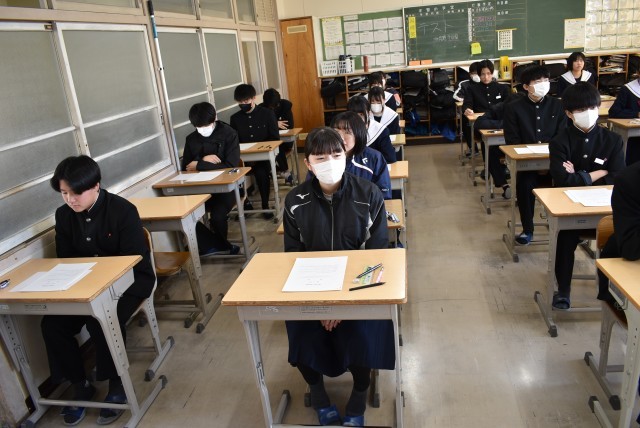 問題用紙(解答用紙)が配付され、テスト開始を待つ12学級の様子です。