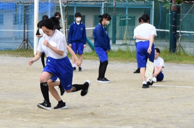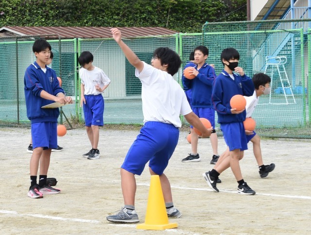 体力テストの50m走とハンドボール投げを行っています。