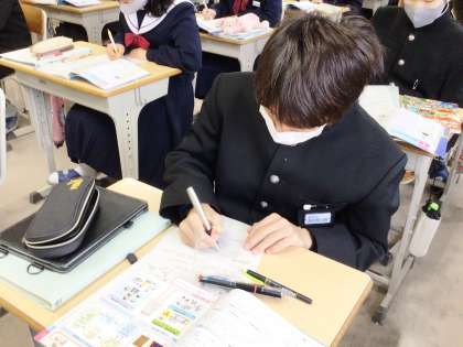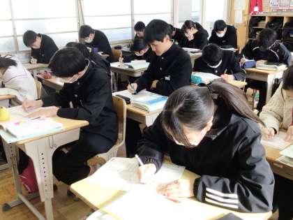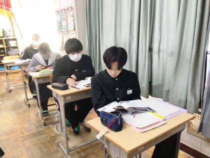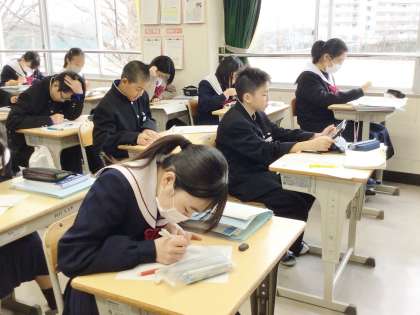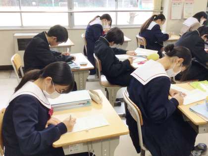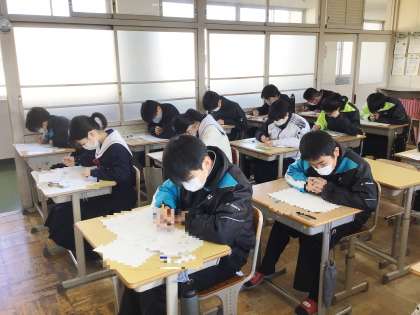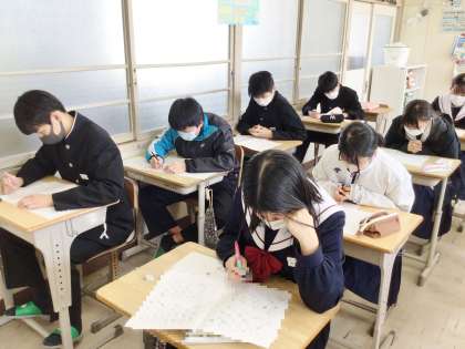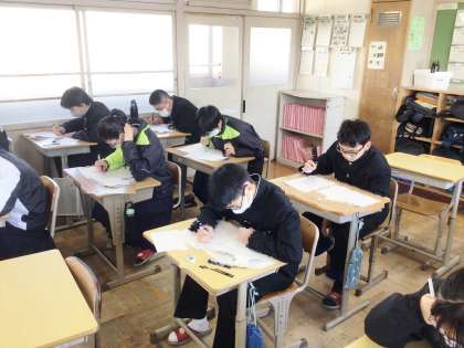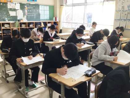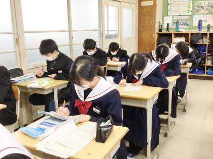 11学級は、数学の授業の様子です。明日行われる学習診断テストに向けて、対策プリントを集中して解いていました。1年生にとっては初めての学習診断テストになります。緊張するとは思いますが、今まで学習してきた成果をすべて発揮できるよう、頑張りましょう。