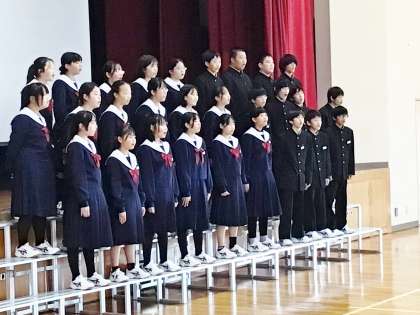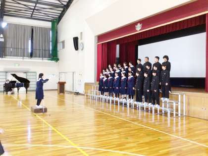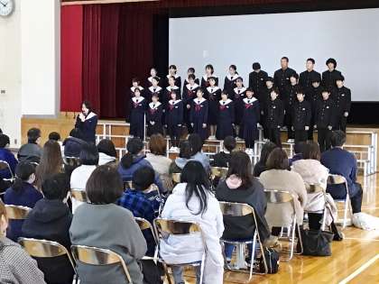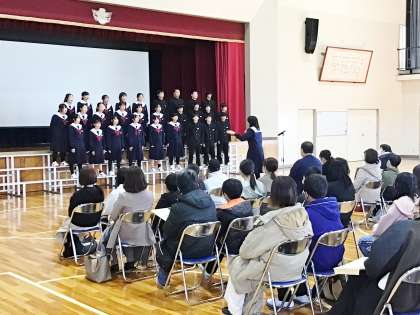 体育館で、6年生と保護者の方々に「COSMOS」を歌っている様子です。