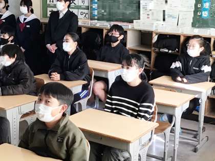 13学級の生徒が、6年3組の児童に中学校の生活・学習・部活動について紹介している様子です。