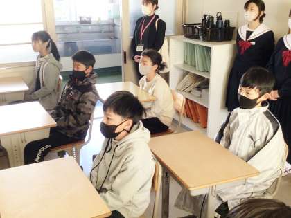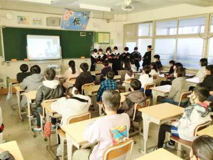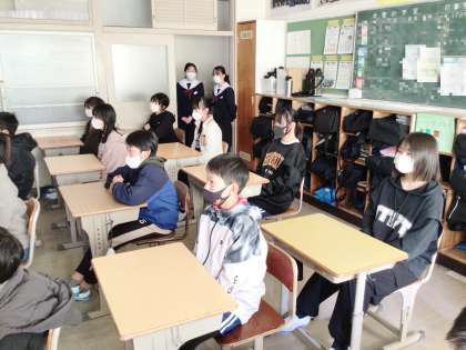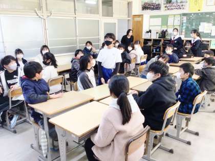 12学級の生徒が、6年2組の児童に中学校の生活・学習・部活動について紹介している様子です。