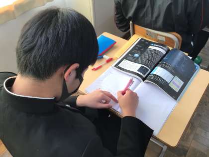 33学級は、理科の「宇宙の中の地球」の授業の様子です。銀河系と宇宙の広がりについて、教師の説明を聞いた後、ノートにまとめながら確認していました。