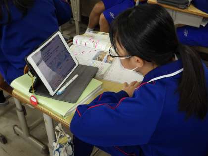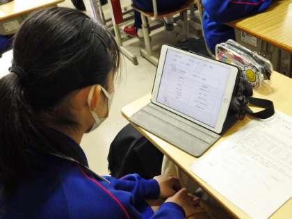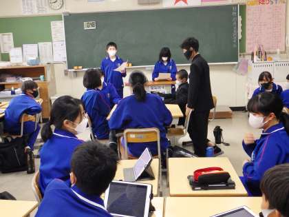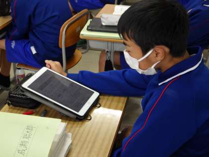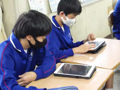 34学級は、国語の授業の様子です。「漢字の造語力」の練習問題を行っていました。疑問点があると学習用タブレットで調べるなど、積極的に進めていました。