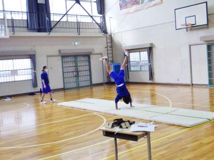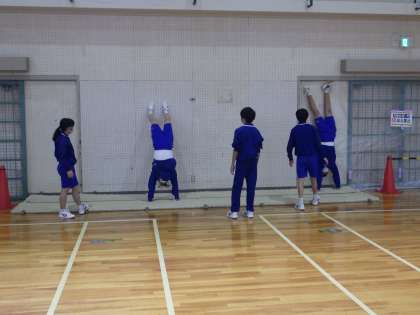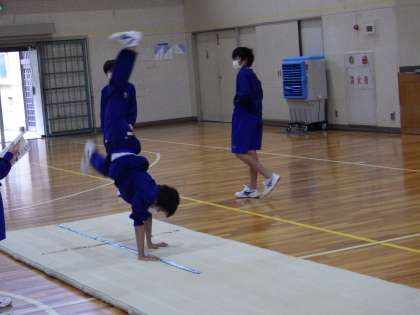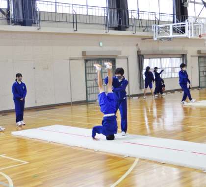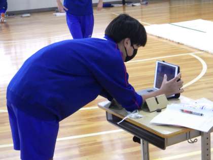 12学級は、体育の「マット運動」の授業の様子です。バランス運動の倒立の練習を行っていました。学習用タブレットで自分の演技の動画を撮影していました。演技後、動画を見ながら確認し、技能習得に取り組んでいました。