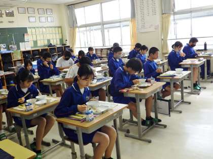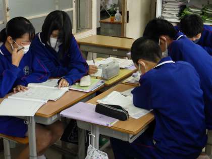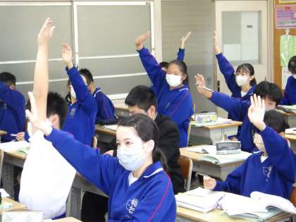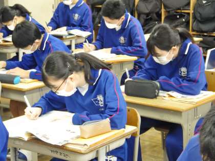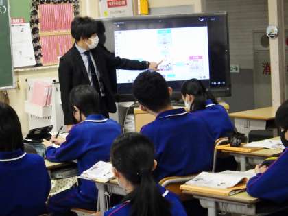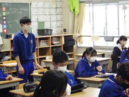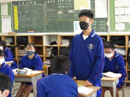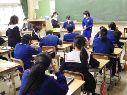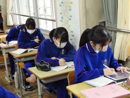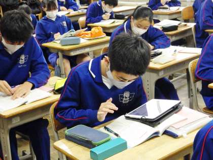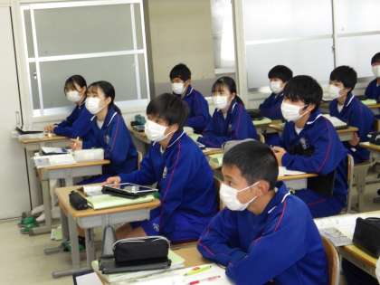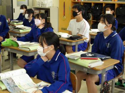 24学級は、社会の「日本の諸地域」の授業の様子です。教師の話を集中して聞いたり、疑問点があると質問したりと、意欲的に学習に取り組んでいました。