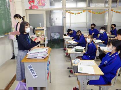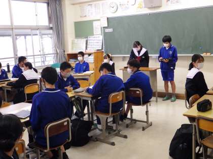 22学級は、英語の授業の様子です。ユニバーサルデザインの内容が書かれている英文を読んだ後、その内容から出された問題を班で話し合いながら解いていました。