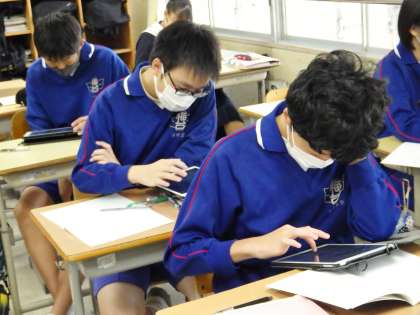 32学級は、国語の「論説文の比較」の授業の様子です。人工知能AIに関する語句を学習用タブレットで調べ、関連がある語句を結び付けていました。