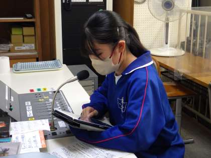 生徒会長が後期の生徒会の取組について放送で全校に話を行いました。その後、学級の各委員会の生徒が、タブレット画面に映し出された各委員会の活動内容等を伝達しました。他の生徒は、活動内容に対して、積極的に質問するなど、意欲的に参加していました。