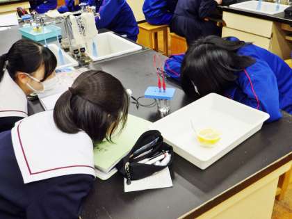 33学級は、理科の「化学変化と電池」の授業の様子です。電池とイオンについて、実験を行いながら検証していました。