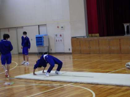 23学級は、体育の「マット運動」の授業の様子です。今日から、この単元に入りました。1年生で学習した技の確認を行っていました。