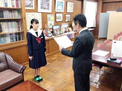 本日、豊田税務署管内納税貯蓄組合連合会の会長が来校し、「税に関する作文」で、優秀賞というすばらしい賞に輝いた生徒の表彰を行いました。会長からは「身近な題材で税について深く考える内容で、すばらしい作文でした」という話がありました。おめでとうございます!