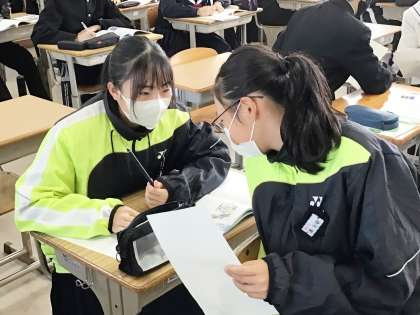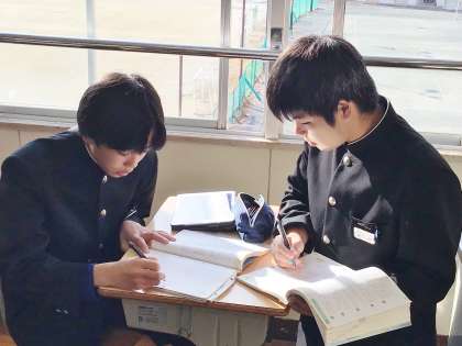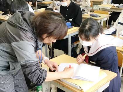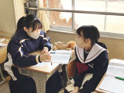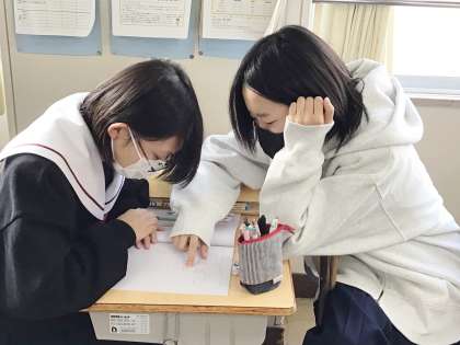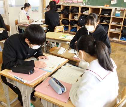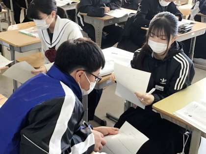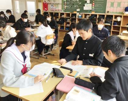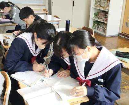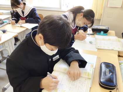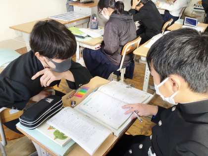34学級は、数学の「図形と相似」の授業の様子です。練習問題を解いた後、級友と解き方・考え方について確認していました。