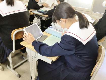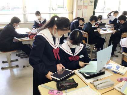 11学級は、数学の「円とおうぎ形」の授業の様子です。キュビナの復習問題を解きながら考え方を確認したり、級友と話し合ったりしながら、理解を深めていました。来週行われる単元テストがんばれ!