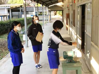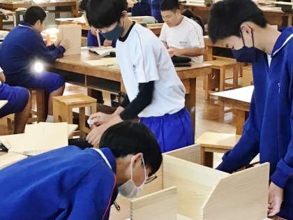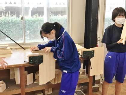 13学級は、技術の「オリジナル木工製作」の授業の様子です。材料の切削を行っていました。切削が終わった生徒は背板製作に取り組んでいました。