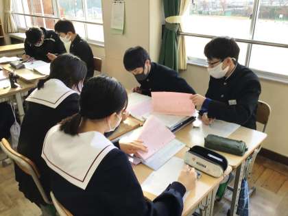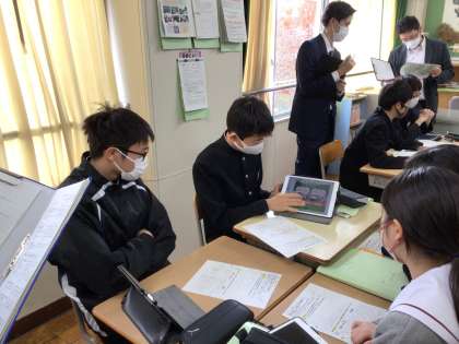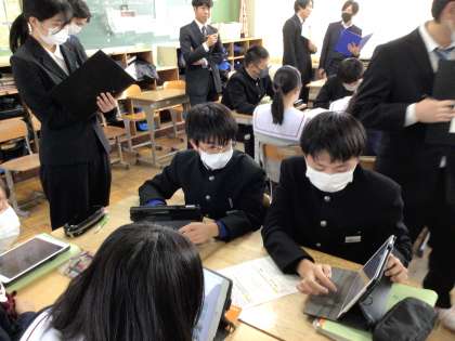 3年3組で社会の研究授業を行いました。豊田市の公共交通機関について、今後どんな政策が必要かを考え意見交換しました。生徒は様々なデータを活用し、根拠を明確にして、自分の考えを堂々と伝えていました。また、記事役の生徒が他の班に取材することで、政策の不備やより良い方法に気づくなど、自分の意見を深める姿がありました。