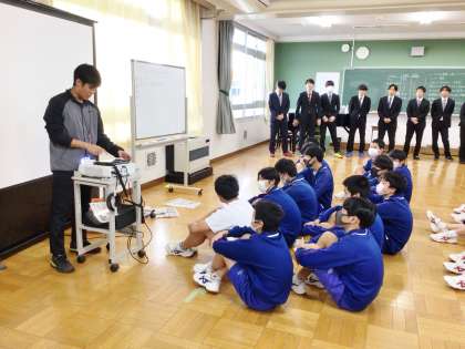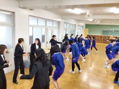 昨日、中京大学の学生が来校し、今後教員になったとき、授業の行い方、生徒への対応を学ぶために体育と社会の授業を参観しました。学生はメモを取りながら授業を参観したり、生徒と一緒に踊ったりと、意欲的な姿勢が見られました。この経験を今後の様々な学びにいかしてくれればと思います。