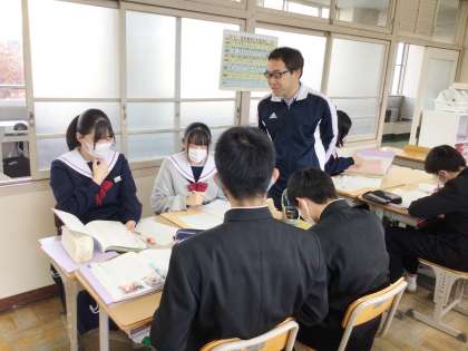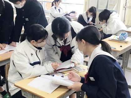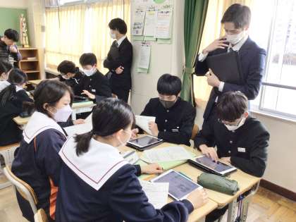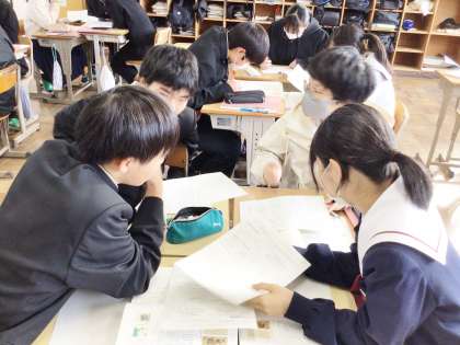 33学級は、英語の授業の様子です。「Read and Think」の本文内容について班で話し合いながら、和訳に取り組んでいました。