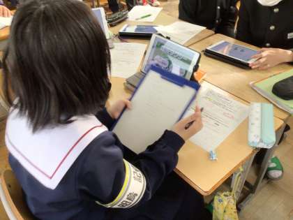 31学級は、国語の「夏草—「おくのほそ道」から」の授業の様子です。松尾芭蕉が旅に出た理由について考えていました。班での話し合いでは、級友の考えに「どうしてそう思ったの?」という問いかけを行いながら理解を深めていました。