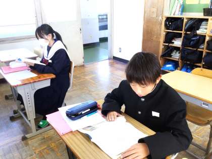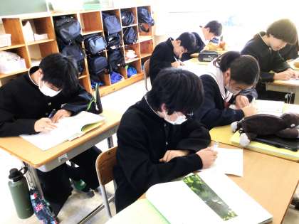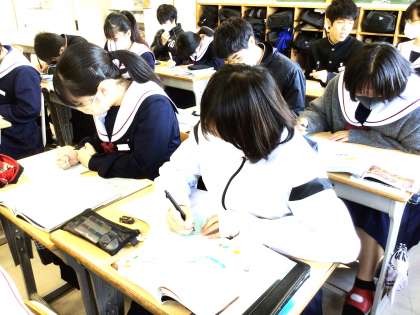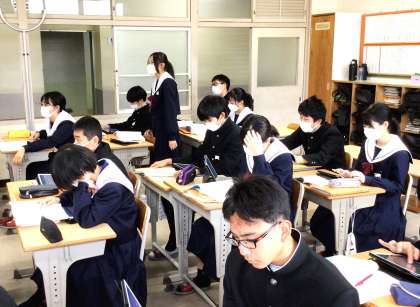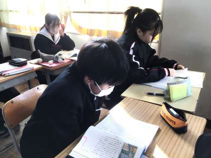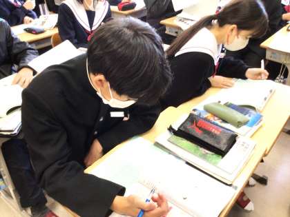 13学級は、国語の「蓬莱の玉の枝—『竹取物語』から」の授業の様子です。古文の読みの練習を行っていました。「古文を読むのは難しい」と呟きながらも元気に声を出して読んでいました。
