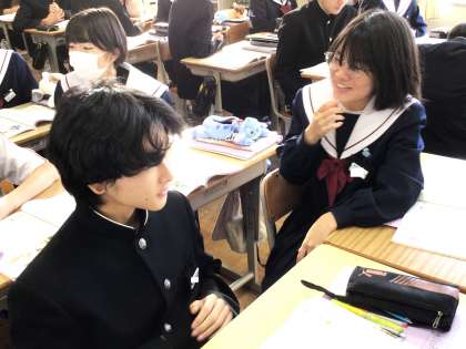 33学級は、英語の「Discover Japan」の授業の様子です。ALTに紹介する日本の文化について、班で話し合っていました。