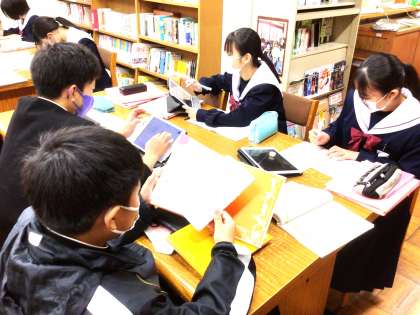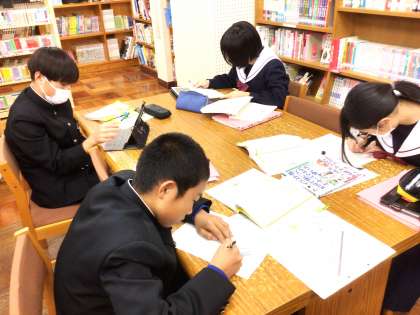 23学級は、国語の「根拠の適切さを考えて書こう」の授業の様子です。自分が選んだテーマに合う本を図書室で選び、その本を読んだ後、根拠を明確にして自分の意見を考えていました。