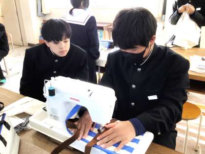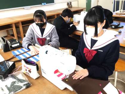 11学級は、家庭科の「バルキーバック制作」の授業の様子です。本日の目標は「本体を中表に半分に折り、まち針でとめて、わきを1.5センチの幅で縫う」です。完成に向けて、着々と取り組んでいました。「縫うのがだいぶうまくなってきた気がする!」という呟きが聞こえてきました。本日も、地域のボランティアの方が生徒に丁寧にアドバイスを送っていました。ありがとうございます。