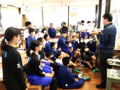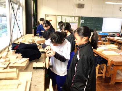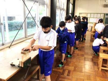 12学級は、技術の「オリジナル木工製作」の授業の様子です。教科担任から「かんながけ」のポイントの説明を聞いた後、「かんながけ」の練習を行っていました。「うまく削れない」「けっこう難しいな」と呟きながら、練習を繰り返していました。