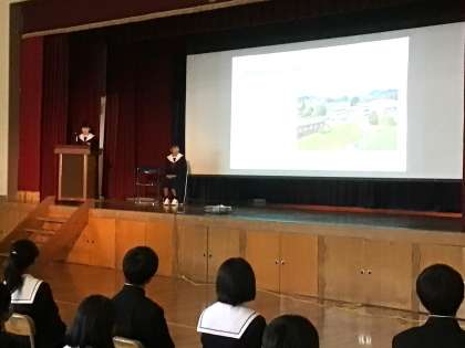本日、海外派遣報告会を体育館で行いました。