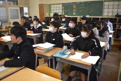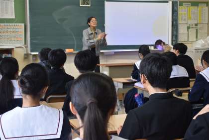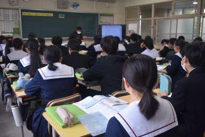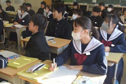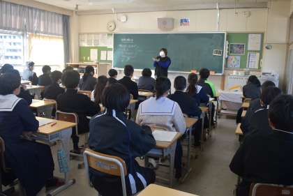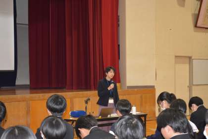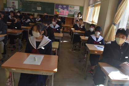 豊田市役所おやこ応援課の職員が2名来校し、3年生に「自分の体と心を知る」のテーマで話をしていただきました。前半は、思春期の気持ちの変化や命の尊さについて、後半は、性感染症やセクシャルネットワークについて、スライドなどの資料を提示しながら、具体的にお話しくださいました。生徒たちは、配付されたワークシートにメモを取りながら、真剣に話を聞いていました。 -