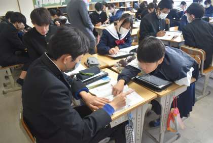 グループで教え合って問題を解いています。