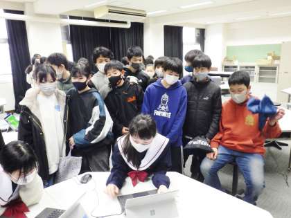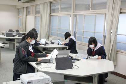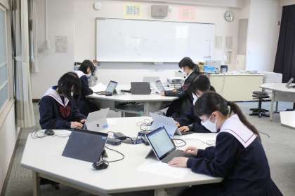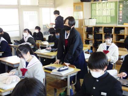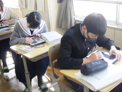 23学級は、家庭科の「家庭生活と消費」の授業の様子です。最近購入したものを学習用タブレットにまとめ、物資とサービスについて考えていました。