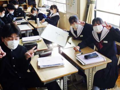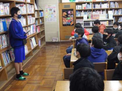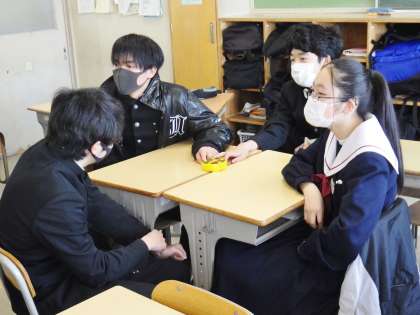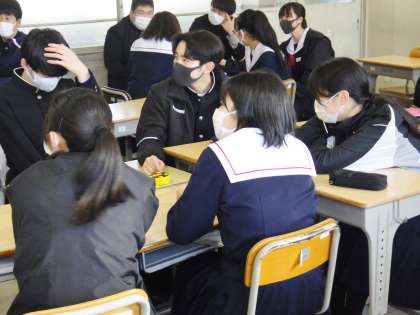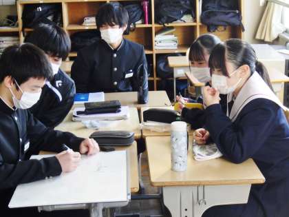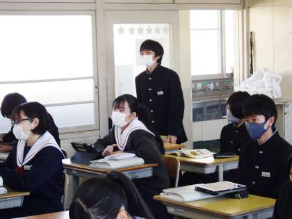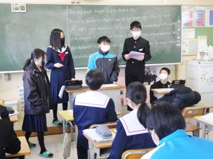 21学級は、英語の「Pictures and Our Beautiful Planet」の授業の様子です。班で話し合った内容を発表していました。