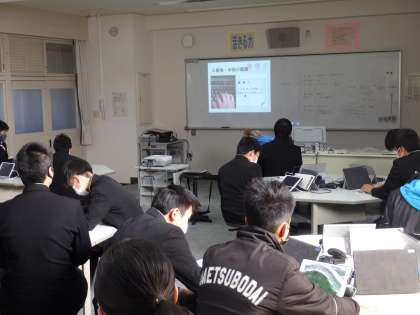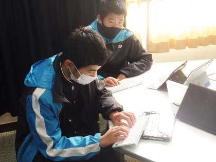 24学級は、技術の授業の様子です。タイピングの練習を行っていました。動画の映像を見ながら、キーボードを打ち、技能を高めていました。