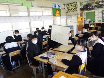 33学級は、英語の授業の様子です。英単語のクイズを楽しそうに行っていました。問題が出題されると「簡単!簡単!」とホワイトボードに答えを書いていました。
