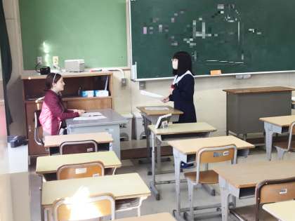 11学級は、英語の授業の様子です。ALTとの英会話を行っていました。ALTからの「Who is your hero?」「Where do you want to go?」に対して、英語で答えながら会話を行っていました。一番下の写真は順番を待つ生徒の様子です。