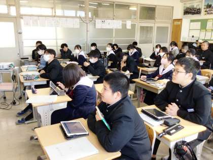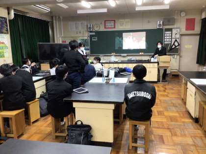 13学級は、家庭科の「持続可能な衣生活」の授業の様子です。衣服に関連したSDGsの取組について話し合っていました。