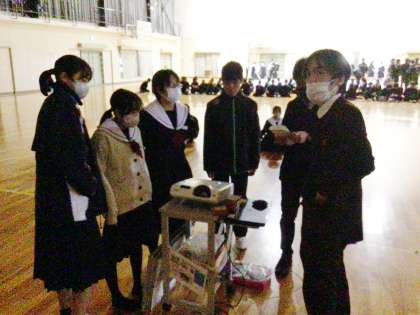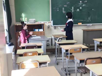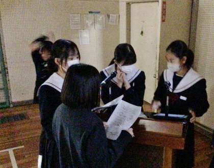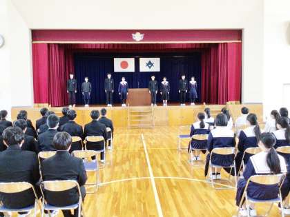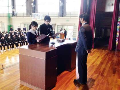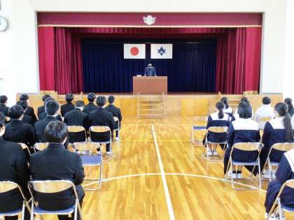 1限に、3年生が同窓会入会式を行いました。同窓会長に代表生徒が誓いの言葉を伝えるとともに、年度理事、学級世話係の紹介も行いました。