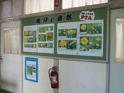 今年度、PTA役員さんからの発案で、「梅坪の自然」と題し、身近な自然について紹介するコーナーを作りました。場所は、第1理科室(1階)北側階段の向かいにある掲示板です。
