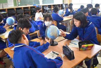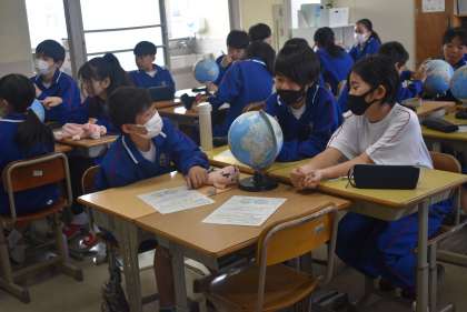 地球儀を使って、グループで緯度や経度、赤道などを探すとともに、北緯、南緯、東経、西経を使って、地球の住所とも言える場所を特定しました。 -
