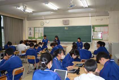 5限に、前期生徒集会を行いました。始めに、生徒会長が全校放送にて生徒会執行部のスローガンなどについて話をした後、学級の各委員会の生徒が、タブレット画面に映し出された活動内容等を伝達しました。活動内容に質問がある場合は、積極的に挙手し聞いていました。