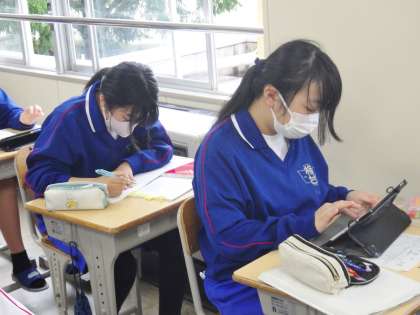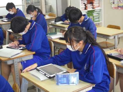 32学級は、家庭科の「持続可能な社会」の授業の様子です。「偽物やコピー商品が法律で禁止されている理由」について、学習用タブレットに自分の考えを書いた後に、話し合いを行っていました。