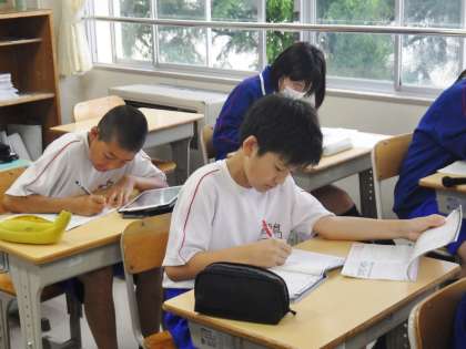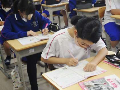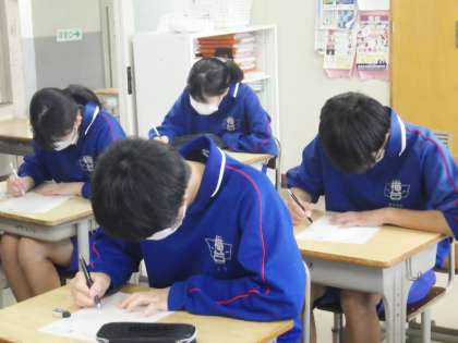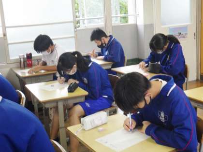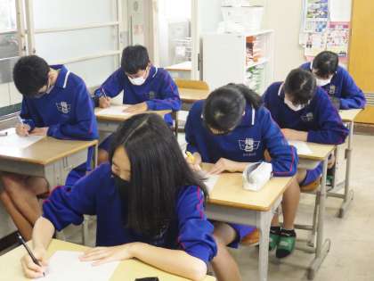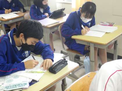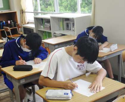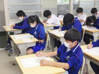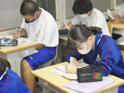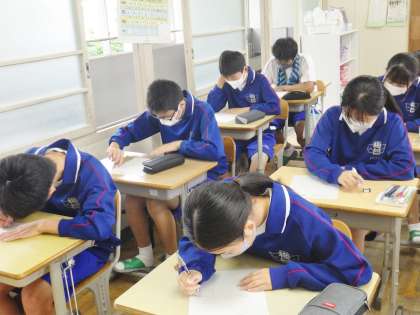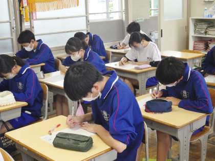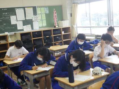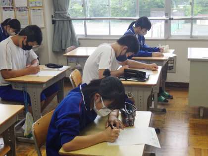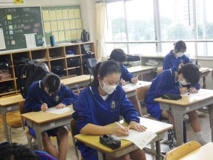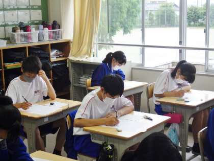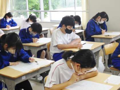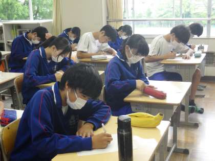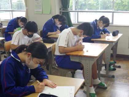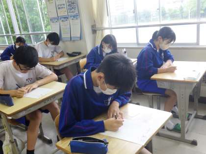 12学級は、数学の「正の数・負の数」の単元テストの様子です。一問一問集中して大切に解いていました。この単元は、今週末に行われる前期中間テストの範囲になっています。解けなかった問題、自信がなかった問題は確実に復習を行い、テストに備えましょう。