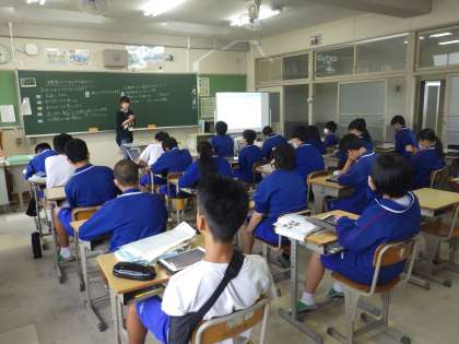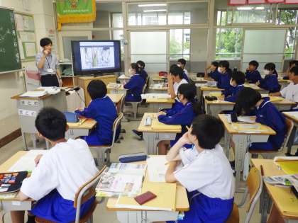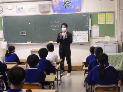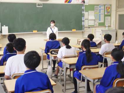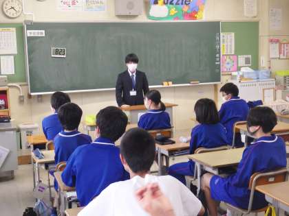 朝の会で、自己紹介を行っていました。教育実習生が「テニスをやっています」と話すと、生徒の「僕もテニスをやっているので、今度、勝負しましょう!」という声で、和やかな雰囲気になっていました。
