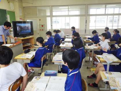 21学級は、社会の「織田信長・豊臣秀吉による統一事業」の授業の様子です。デジタル教科書の大阪城の映像を見ながら当時のイメージを膨らませた後、豊臣秀吉の政策について話し合っていました。